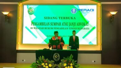 Ketua PT Surabaya ketika melakukan penyumpahan Surabaya, JejaringPos.com – Organisasi Advokat Surabaya DPC Perhimpunan Advokat Indonesia (PERADI) Surabaya, Baru saja melahirkan total 426 orang anggota sebagai pengacara baru, hari ini Selasa (22/7/2025) telah dilakukan penyumpahan oleh Ketua Pengadilan Tinggi (PT) Surabaya H.Charis Mardiyanto,SH,MH. Ketua DPC Peradi Kota Surabaya Advokat senior Hariyanto,SH,M.Hum mengatakan kepada wartawan, usai acara penyumpahan di Aula PT…