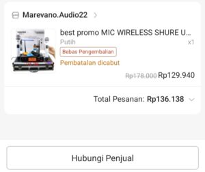 Ironisnya, Toko online yang menawarkan produk Mikrofon Wireless sesuai tercantum nama pada aplikasi “Toko Marevano Audio22” dibandrol harga Rp 136 Ribu. setelah paket diterima tidak sesuai tak lama kemudian Toko tersebut sudah tidak bisa dihubungi lagi termasuk 2 nomor selular 082196417929 dan 082141386322, Melainkan tertulis pesan Toko telah dihapus dan diblokir.