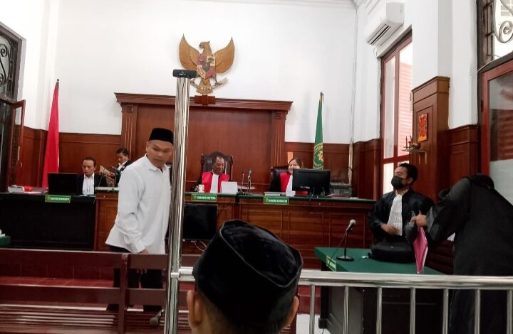 Terdakwa Adrian Fathur usai jalani sidang penundaan (Berdiri Baju putih)