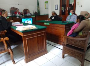 Foto : Kanan istri korban menggendong putrinya, Tiga dari kanan, terdakwa didampingi penasehat hukum